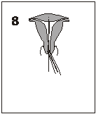 八、 輕輕地牽拉一下尾絲以確定吉妮已適當(dāng)?shù)墓潭ㄓ谧訉m底。然后,在距子宮外口 1.5—2cm 處剪斷尾絲,如果需要也可在子宮頸管內(nèi)剪斷尾絲。